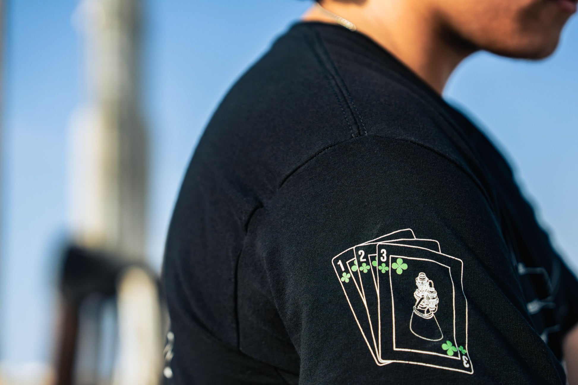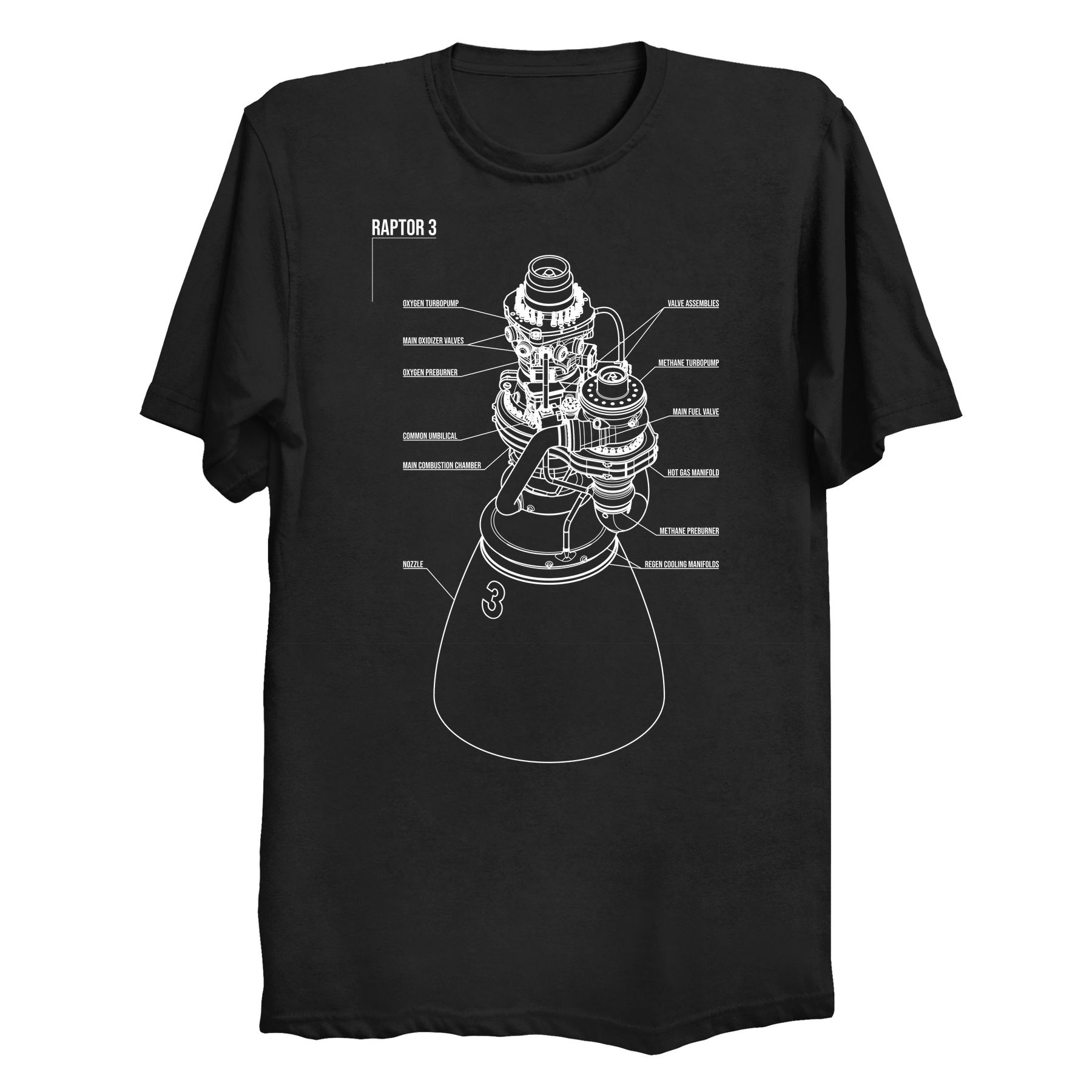 This tee, with art by TheSpaceEngineer, depicts the Raptor 3 engine in all of its glory. Featuring a set of cards on the shoulder, a completely accurate model of Raptor 3 on the front, and a flow graph of Raptor 3 on the back, it's both an educational piece... and one that looks awesome.